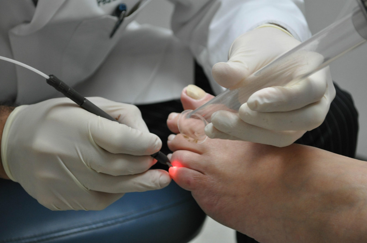 O laser tem propriedade fototóxica ao fungo quando associado ao uso de um corante específico de cor azul.